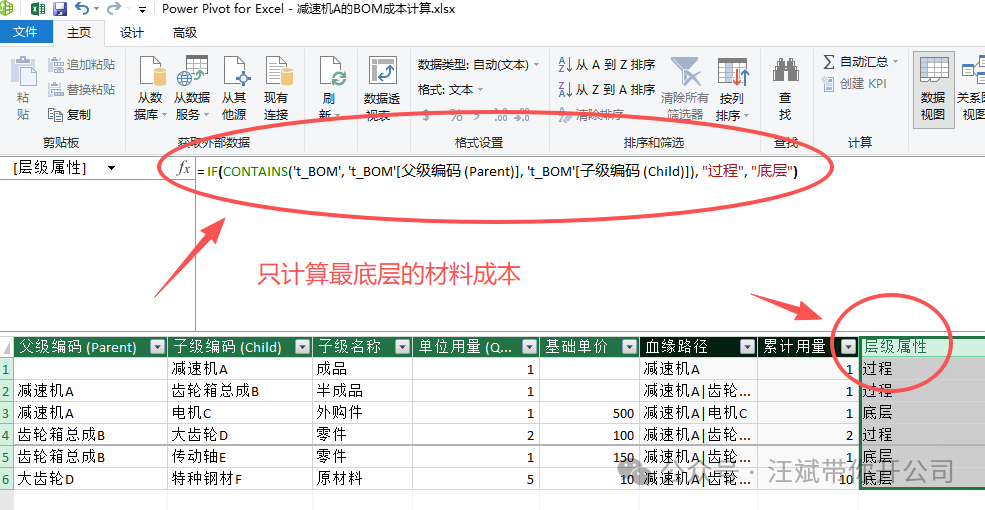 小编解读:不要被这么长的函数吓到。这就好比一台“全自动剥洋葱机”。PRODUCTX 是连乘引擎,它根据层级(1、2、3、4),一层层揪出路径里的名字(减速机、齿轮箱...),然后用 LOOKUPVALUE 去找对应的单耗,最后全部相乘。算完后,钢材F的累计用量自动得出:10kg。 在核算成本时,财务最怕的就是“重复计算”导致出现膨胀错误。大齿轮的成本里已经包含了钢材,如果汇总时把大齿轮和钢材都算进去,成本就会虚高。所以,我们要设一道防火墙:只算最底层原材料的钱。 新建列公式(命名为“层级属性”),找出谁是最底层: