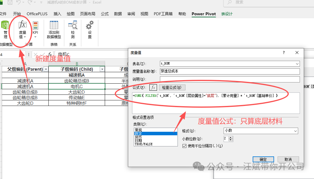 小编解读:这段逻辑极度巧妙。它拿着当前行的名字(即子级编码(child))去“父级”那一列里扫街,如果能扫到(行数>0),说明有人叫它爸爸,它就是“过程件”;如果扫不到,说明它下面没孩子了,它就是“底层原材料”,比如电机C、传动轴E、特种钢材F,它在父级那一列找不到,所以他只能是底层了。 最后,写出算钱的终极度量值: