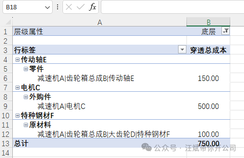 小编解读:这条计算函数彻底锁死了“过程件”,它只允许底层材料参与乘以单价的计算。这也是为什么我们在随后的透视表里筛选“过程件”时,结果会是一片空白的原因——它保护了成本的真实性,绝对不会出现重复计算的情况! 关闭 Power Pivot,回到 Excel 画布,插入一个数据透视表。把 血缘路径 拖入行,把 穿透总成本 拖入值。 你不仅会看到“减速机A”的总成本精准算出了 750元,你还拥有了一套无坚不摧的“成本动态模拟器”!