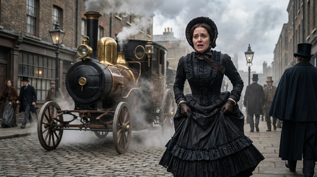 镜头小幅度拉远并跟随女主移动,风吹起裙摆,女主走在 19 世纪的伦敦大街;右边驶来蒸汽机车,快速掠过,女主惊慌地用双手捂住裙摆。