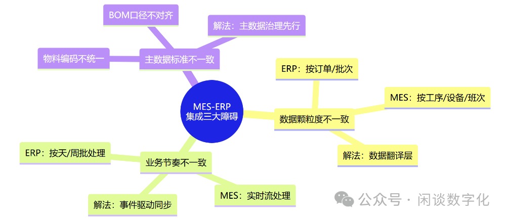 根因:三个"不一致" 我后来复盘了不少MES-ERP集成的案例,发现问题大多逃不出三个"不一致": 第一,数据颗粒度不一致。 ERP管的是"计划",粗一点没关系——这批订单什么时候交、用多少料、成本多少。MES管的是"执行",必须精细到每一道工序、每一台设备、每一个班次。 把"粗"的数据往"细"的系统里灌,不做翻译和拆解,MES接了等于没接。 第二,业务节奏不一致。 ERP是按天甚至按周运转的——月度计划分解到周计划,再到日计划。MES是实时的——这条产线这一秒在干什么,良品率多少,设备OEE(综合效率)是多少。 一个"批处理"思维,一个"流处理"思维。如果集成方案没有处理好这个节奏差,就会出现一个经典场景:ERP上午排好的计划,到了下午车间已经因为插单改了三次,但ERP还不知道。 第三,主数据标准不一致。 ERP里的物料编码、MES里的物料编码、WMS里的物料编码——三套系统,三套编码规则。这种情况比想象中普遍得多。 我见过最离谱的一个案例:同一个零件,ERP里叫"M-200301",MES里叫"P-ZJ-0301",仓库管理系统里叫"CK200301"。每次对账都要一个老师傅人肉翻译。 怎么做:三步走,别想一口吃成胖子说完病因,说治法。我的经验是分三步走,每一步扎实了再迈下一步。 第一步:先对齐主数据,再谈集成。 很多企业犯的第一个错误就是:MES项目一启动就急着做接口开发。但如果主数据没有治理好,接口做得再漂亮,跑出来的数据还是垃圾。 具体怎么做?BOM、物料编码、工艺路线、设备台账——这四样东西先花一到两个月理清楚。不要嫌慢,这一步省下的是后面半年的返工。 我以前的做法是拉一个"主数据对齐小组",把IT、工艺、生产、仓储的人关在一间屋里,一条一条过。很痛苦,但很有效。 第二步:先通核心流程,再扩外围。 不要一上来就搞"全面集成"。先挑一到两条最核心的业务流程打通,比如: