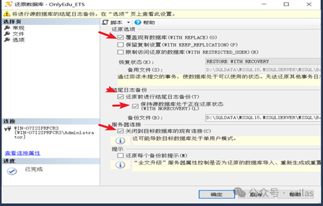 RESTORE DATABASE OnlyEdu_ETSFROM DISK='D:\Backup\OnlyEdu_ETS_full.bak'WITH NORECOVERY
