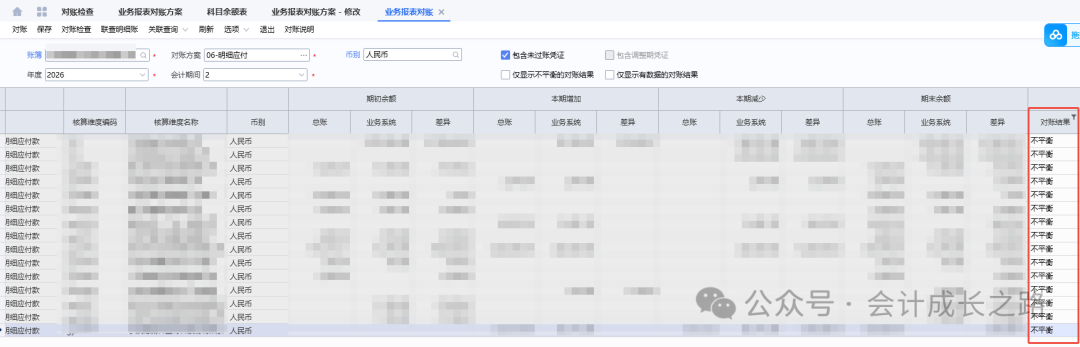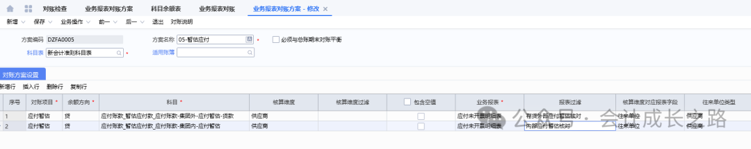 今天讲讲金蝶云星空结账流程中第20步对账工作,有2种方法:将科目余额表和对应单据明细导出来手工核对;还有一种是利用系统的对账功能。下面我们详细讲讲系统对账功能的使用。之前都是手工核对,这个功能今天刚学习才开始启用,第一次设置会经常出现对账结果不平衡,需要反复修改对账方案。建议先手工核对一遍,有了对账结果,再使用设置的对账方案对账,这样差异在哪里,怎么调整对账方案就有思路了。1、暂估应付对账(科目余额表应付暂估余额与应付未开票明细表余额核对)金蝶入口:财务会计-智能会计平台-业务报表对账方案;财务会计-智能会计平台-业务报表对账-选择对账方案-勾选包含未过账凭证-对账-对账结果-不平衡的去查原因解决。一般差异由手工凭证造成差异,正常情况走模块对账基本平衡。- 比如成本调整单调整:在供应商发票未入账之前,发现采购合同单价远高于往期结算价导致暂估应付单中存货金额偏高,而采购又不退货重下订单,此时为了存货金额不受影响,做了成本调整单(借:应付账款暂估,贷:原材料)。