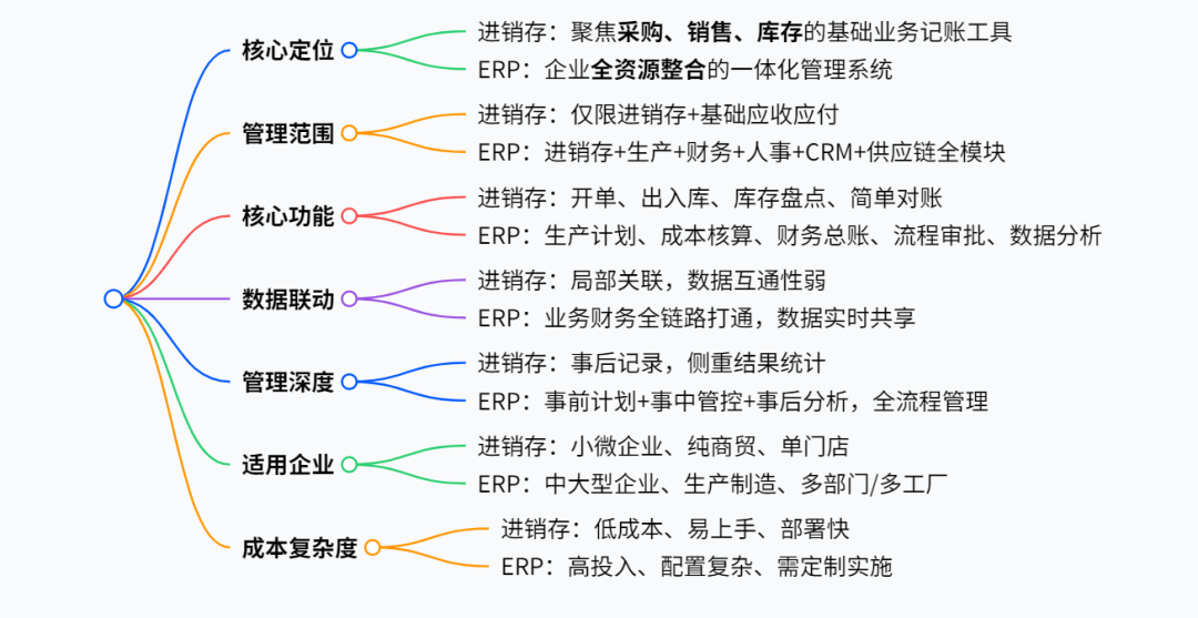 如果这个阶段强行上ERP,很容易出现一种情况——系统成了管理负担。 因为ERP的逻辑是先定义规则,再运行,而很多成长企业的真实情况是边做边改。 所以很多企业早期其实更适合用一些轻量系统,比如进销存系统、表单系统、轻量业务系统,等业务稳定以后,再逐步升级ERP。 这样反而更顺。 ![]() 06 企业到底该上ERP,还是进销存? 其实这个问题,可以用一句非常简单的话总结。 进销存是管“买卖”的,适合贸易公司和小型企业,核心管理内容是采购、库存、销售订单。 如果企业规模还不大,业务流程也不复杂,进销存其实已经够用了。 WMS是管“仓库”的,适合仓库规模大、库位复杂、出入库频繁。核心能力是库位管理、条码管理、拣货路径、库存准确率。 ERP是管“资源”的,适合业务规模比较大的企业。它解决的是订单、采购、生产、库存、财务这一整套资源协同问题。 07 很多企业真正需要的,其实是系统组合 现实企业里,其实很少只有一个系统,更常见的情况是:CRM + 进销存 ERP + WMS ERP + CRM 因为企业管理本来就是多个模块组合。