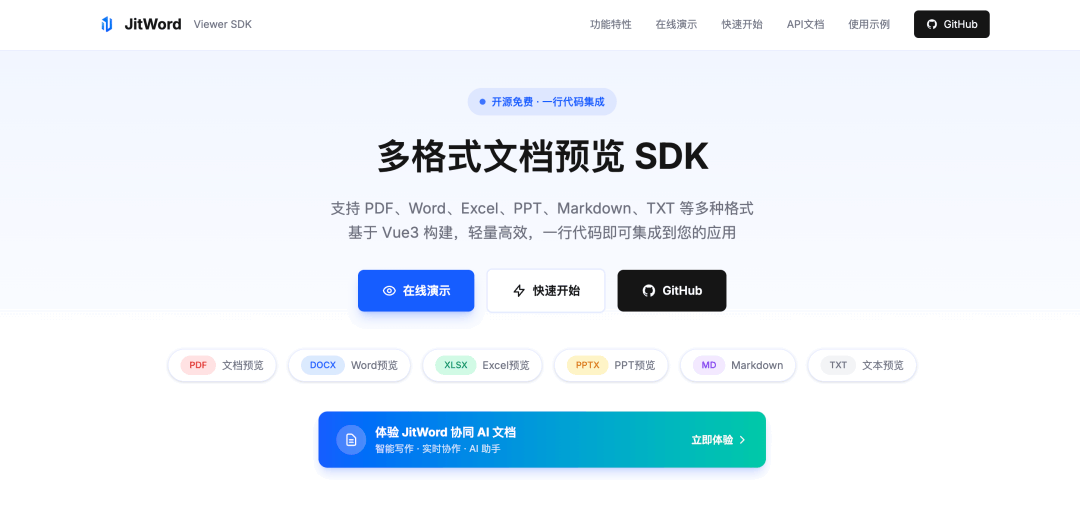 它是一个纯前端文件预览SDK,支持 Word、Excel、PPT、PDF 四大主流格式(当然我们也支持了Markdown, TXT格式的预览),同时对 Vue/React/Angular/Svelte 全框架兼容,无需后端转换,浏览器能直接渲染。大家可以把这个 sdk 轻松集成到任何系统,并实现文件的一键预览,目前项目已开源:github:https://github.com/jitOffice/jit-viewer-sdk国内镜像:https://gitee.com/lowcode-china/jit-viewer演示地址:https://jitword.com/jit-viewer.html