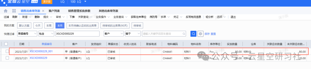 有些企业销售出库单要走审批流,然后仓库比较懒,提出在销售出库单审核中就可以拆单。由于系统不允许非已审核状态下的单据直接拆单,但可以通过以下方法进行变通处理。从源头规避拆单需求:无需拆单,直接在发货通知单层面实现“部分出库”,这时需要将审核中的销售出库单放开数量字段的锁定性,修改数量之后保存。后续从发货通知单下推剩余的销售出库。