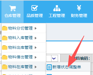 操作步骤:仓库管理-物料在库管理-新增状态调整单