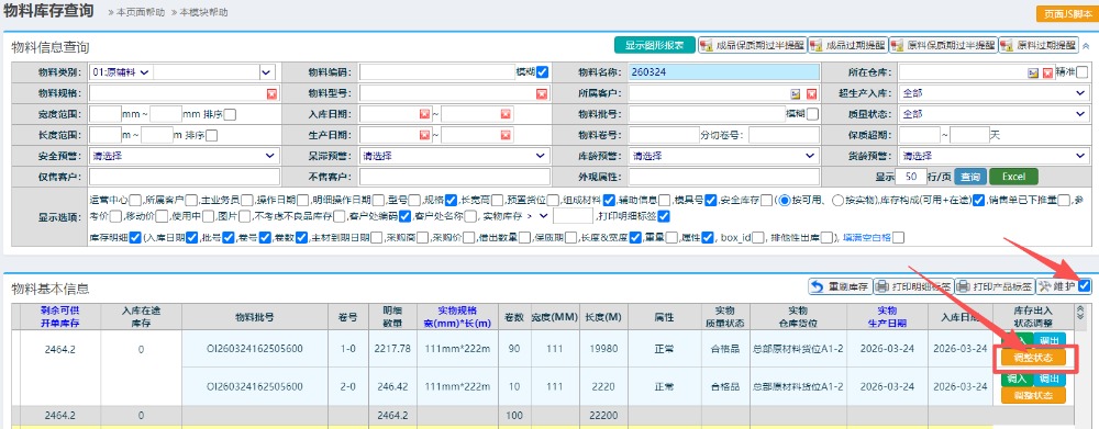 进入界面后,搜索需要调整的库存,勾上“维护”按钮,点击对应明细后面的“调整状态”按钮,如下图: