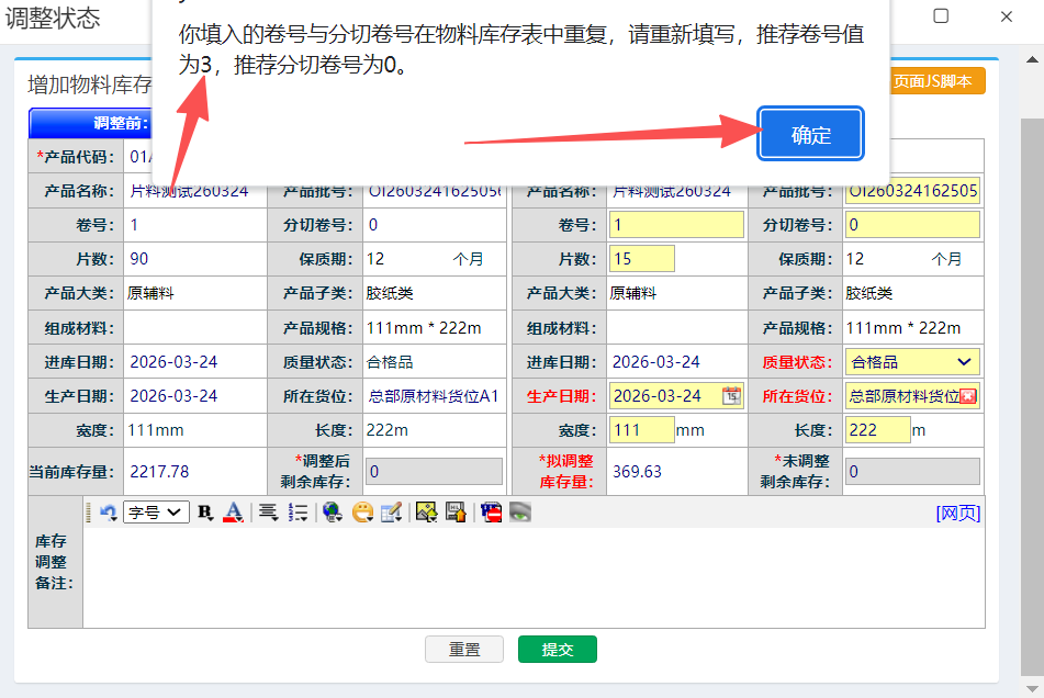 点击提交,弹出提醒,按照提醒修改卷号,点击确定按钮,修改卷号,然后再次提交完成