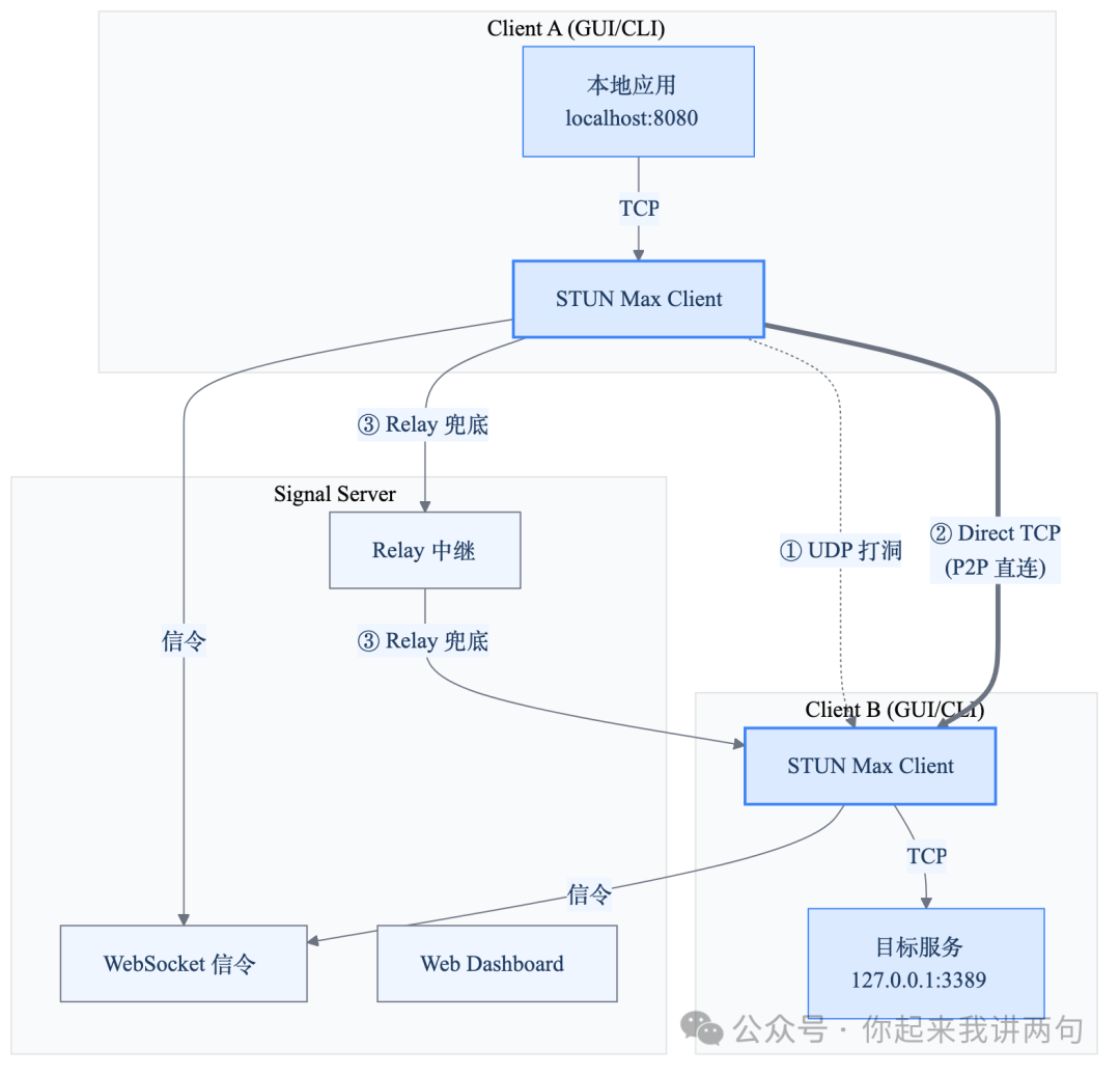 ▲ 图 1:STUN Max 整体架构 打洞是怎么实现的 NAT 穿透这事,说起来简单,做起来全是坑。我的方案分四步: 第一步:STUN 发现公网地址 每个 client 启动后,向 STUN 服务器发一个 UDP 包。STUN 服务器告诉你:「外面的世界看到你的地址是 1.2.3.4:5678」。这就是你的公网映射地址。 第二步:交换端点 + 打洞 两个 client 通过信令服务器交换各自的公网地址,然后同时向对方发 UDP 包。这就是经典的「UDP Hole Punching」—— 双方同时往对方的 NAT 上「戳洞」。 我做了一些优化:20 个 PUNCH 包 / 500ms 快速突发,对 Symmetric NAT 还会用 Birthday Attack(8 个额外 socket 并行打洞)和端口预测。 第三步:TCP 直连升级 这是我踩了最多坑才想明白的一步。一开始我直接用 UDP 传隧道数据,结果丢包、乱序、加密竞态,各种问题。 UDP 不保证顺序,不保证到达。用它传 TCP 流数据,就像用卡车运水——洒一路。 最终方案:UDP 打洞成功后,在同一个 NAT 映射上建立 Direct TCP 连接。TCP 天然提供可靠传输 + 有序 + 流控。隧道数据走这条 TCP,稳如老狗。 第四步:自动 Relay 兜底 如果打洞失败(比如双方都是 Symmetric NAT),数据自动走 WebSocket Relay 中继。用户无感知,只是速度慢一点。