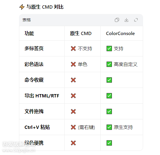 一、工具简介:ColorConsole 是一款经典、轻量、免费的 Windows CMD 命令提示符增强 / 替代工具,由 Nenad Hrg 开发,主打彩色界面、多标签、命令收藏、结果导出,完全兼容原生 CMD。