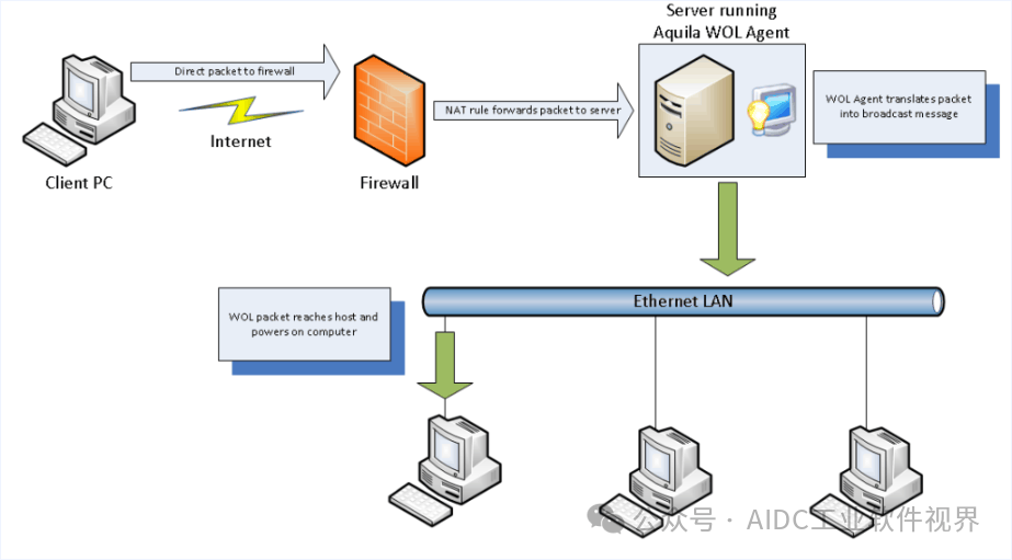 如果需要使用互联网访问,需要在对方内网机器先安装WOLAgent_1.4.0.0.exe。互联网方式控制的工作流如下图,正常情况无需使用。
