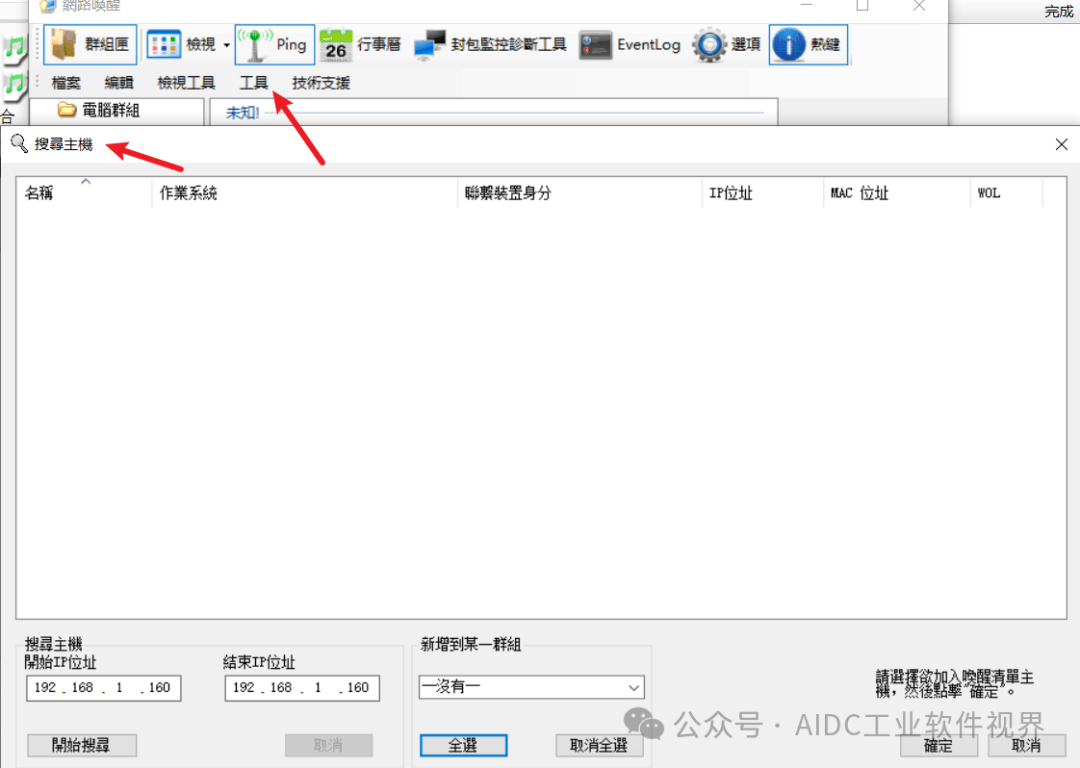 2.第一次使用,打开工具,搜寻主机,输入IP网段,需要机器在线,会自动搜寻和显示,然后按需选择添加。