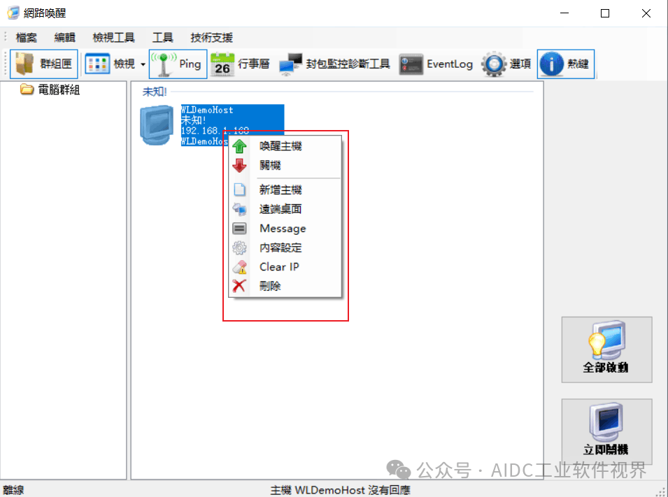 3.完成后,就会看到主机列表,可以左侧建组和添加多台主机。右键单击主机,显示选项如下图,默认直接选择唤醒主机。如果双击,是直接调用Windows的远程桌面连过去。