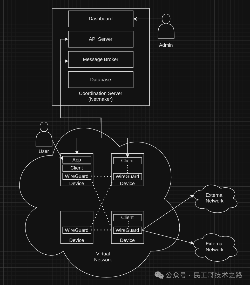• Netmaker Server:管理网络的核心组件,提供可视化界面和 gRPC 服务,存储网络配置并管理节点状态。
