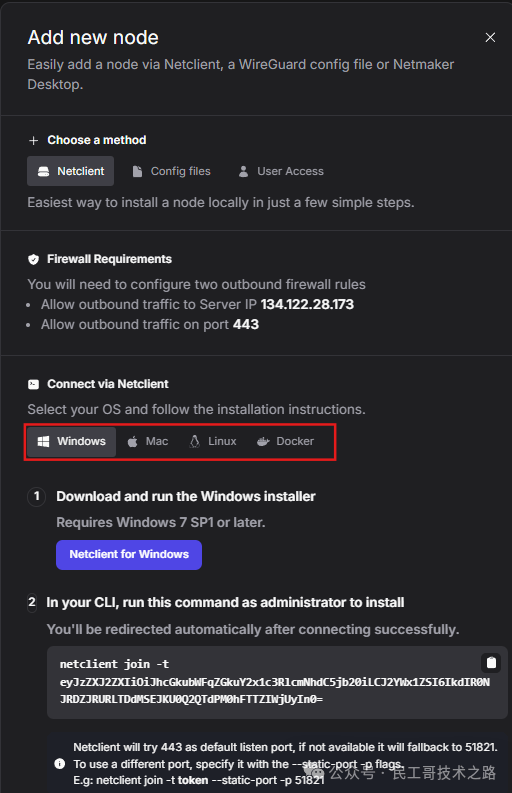 Windows下载链接:https://fileserver.netmaker.org/releases/download/latest/netclientbundle.exe 下载文件后双击直接安装即可。