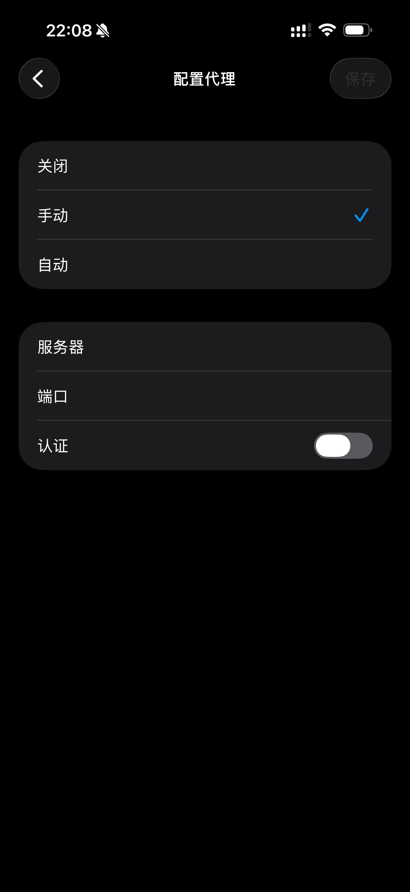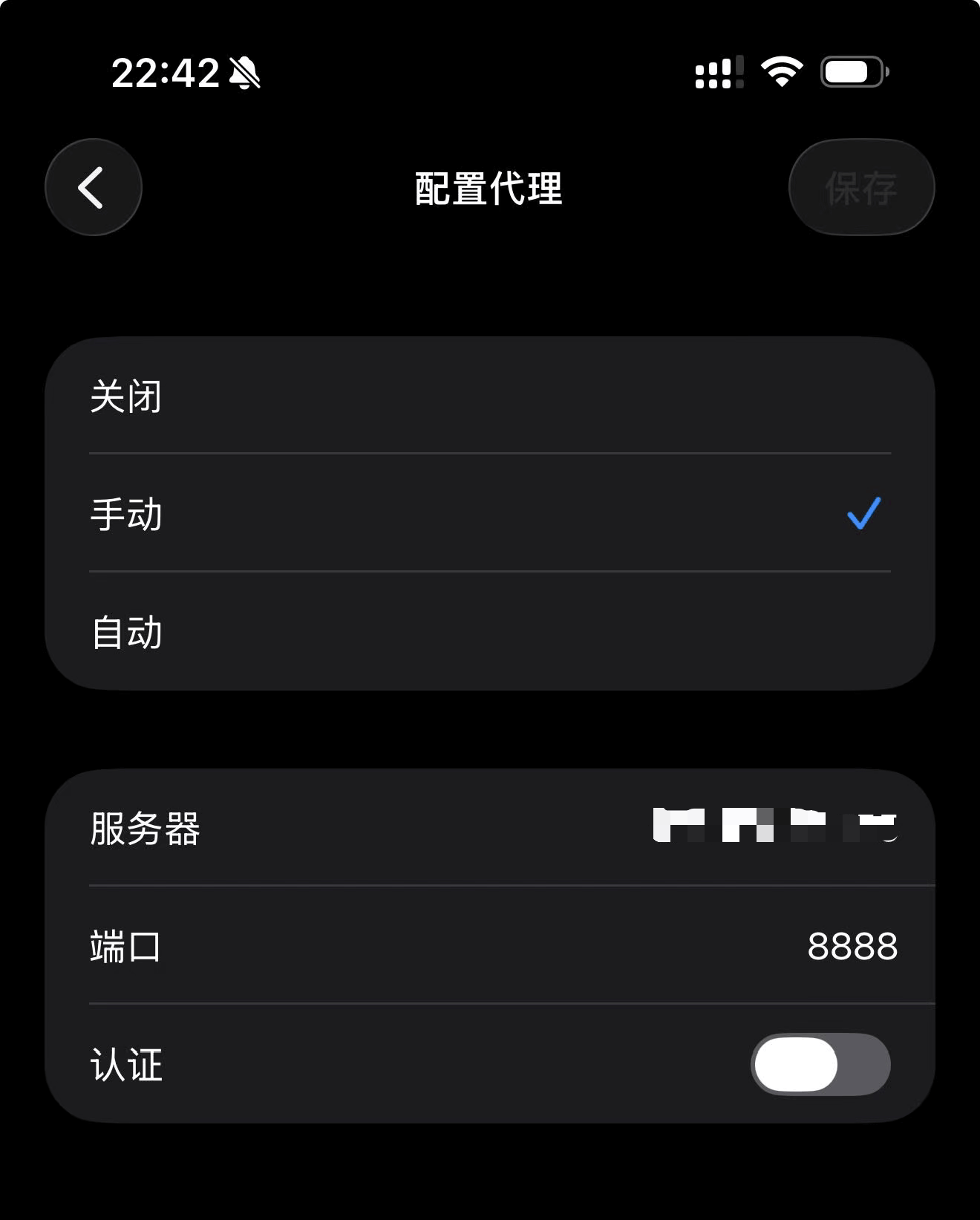 - 手机上设置HTTP代理为手动:划到最下面,设置代理为手动,服务器填处于同一局域网的那个IP,端口填写刚查到的端口号。