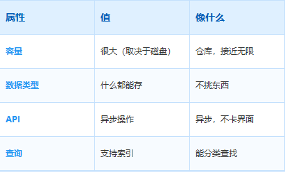 IndexedDB 是浏览器内置的数据库。容量巨大,能存文件、音频、视频这些大东西。