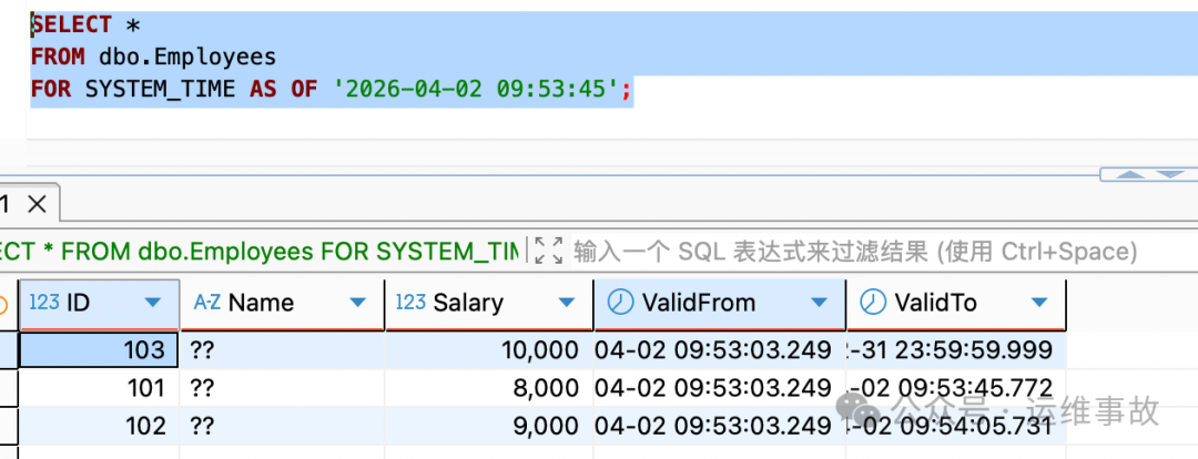 SELECT *FROM dbo.EmployeesFOR SYSTEM_TIME AS OF '2026-04-02 09:53:45';