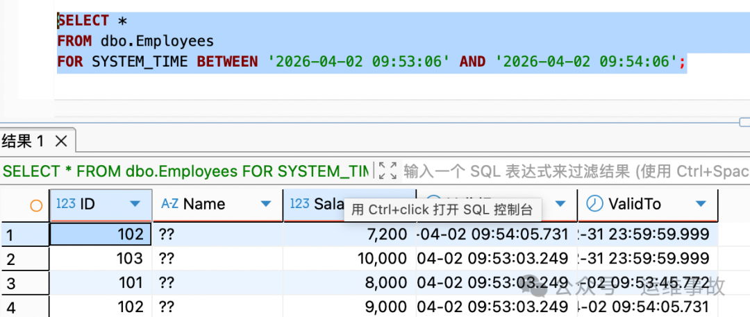 SELECT *FROM dbo.EmployeesFOR SYSTEM_TIME BETWEEN '2026-04-02 09:53:06' AND '2026-04-02 09:54:06';