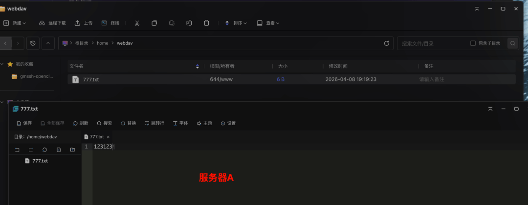 新建一个文件,并且写入,到被挂载的服务器A查看是否同步发现同步正常,功能验证成功,这样,我们就完成了通过nginx快速搭建WebDav服务实现服务器之间的文件共享