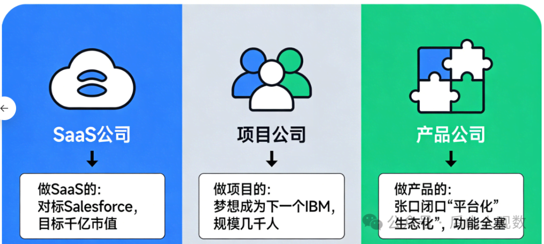 因为这个行业,头部效应太明显了,仿佛给大家直接指明了路径,就这么做就可以;比如:做SaaS的,对标Salesforce,目标是千亿市值;做项目的,梦想成为下一个IBM,动辄几千人规模;做产品的,张口闭口“平台化”、“生态化”,恨不得把所有功能都塞进去。