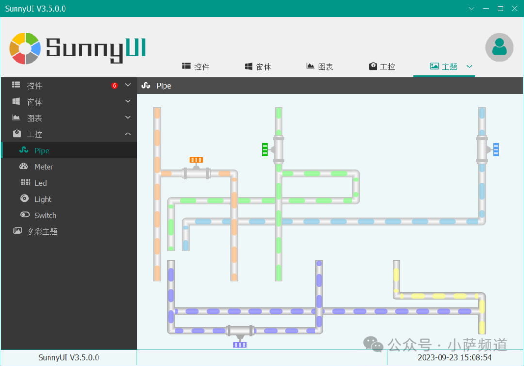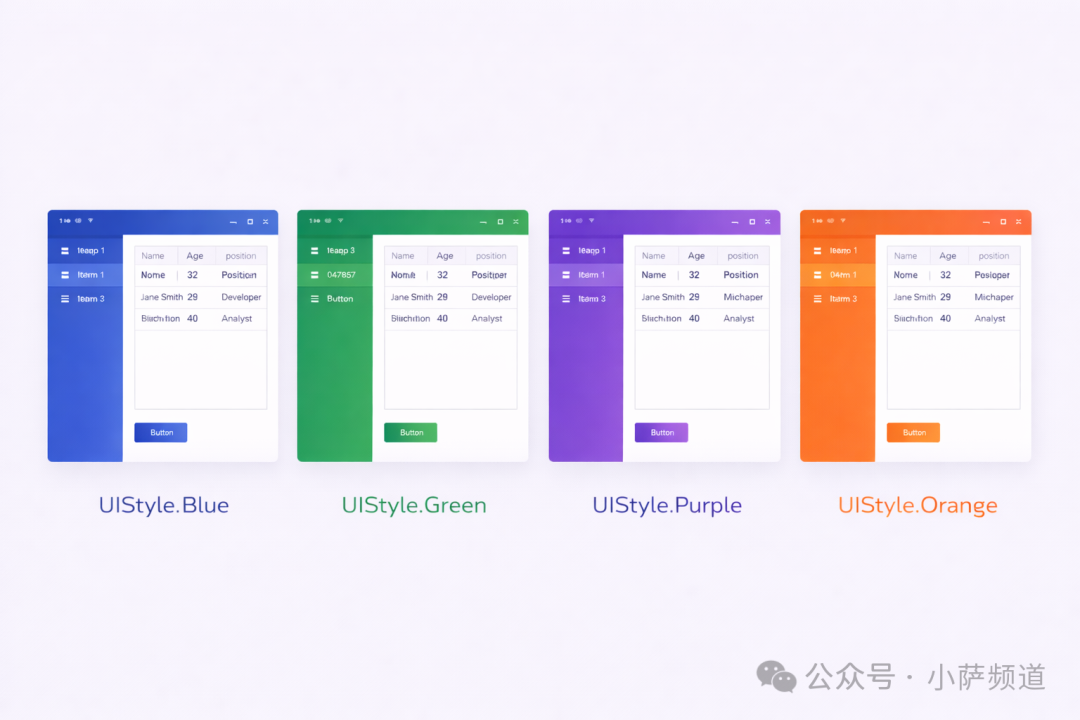 SunnyUI 内置了 17 套主题风格,包括蓝色、绿色、红色、紫色等常见配色,以及一套从 Element UI 借鉴而来的设计语言(所以叫 SunnyUI)。用起来只需要一行代码: