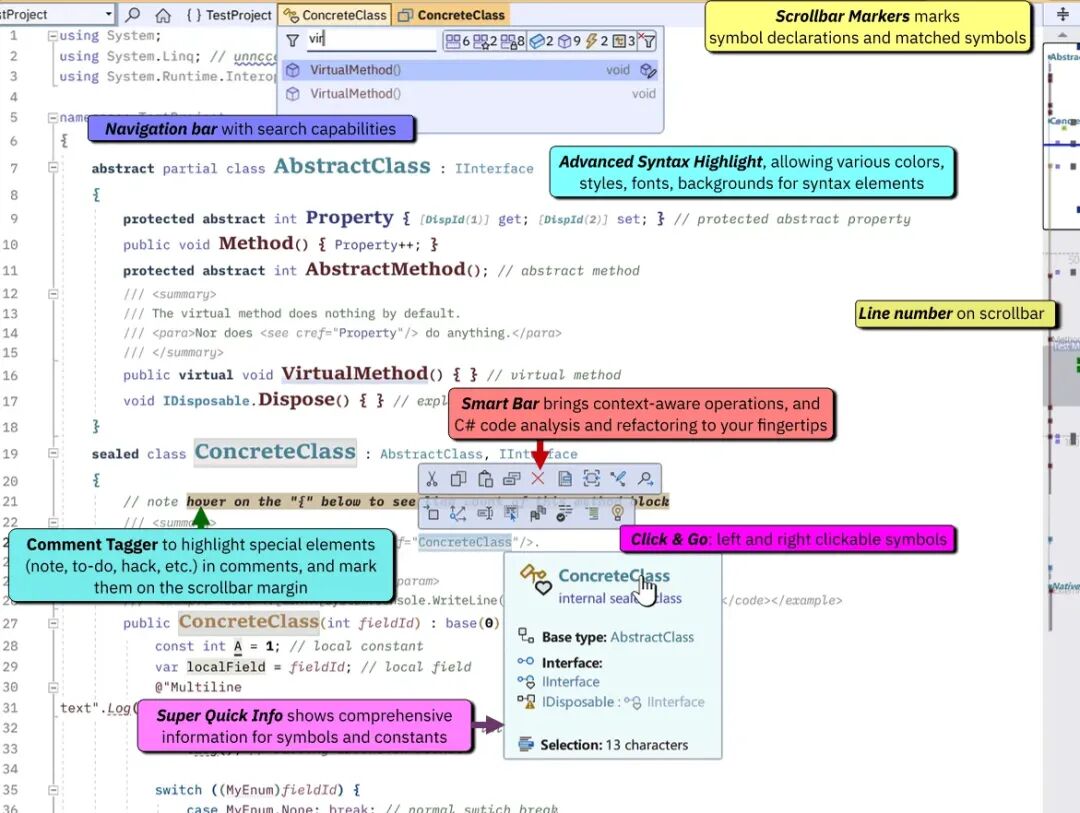 • 功能描述: 支持对 C# 语言元素进行全方位的语法高亮显示,包括各种字体样式、下划线样式、字体大小调整、前景色和背景色更改等。