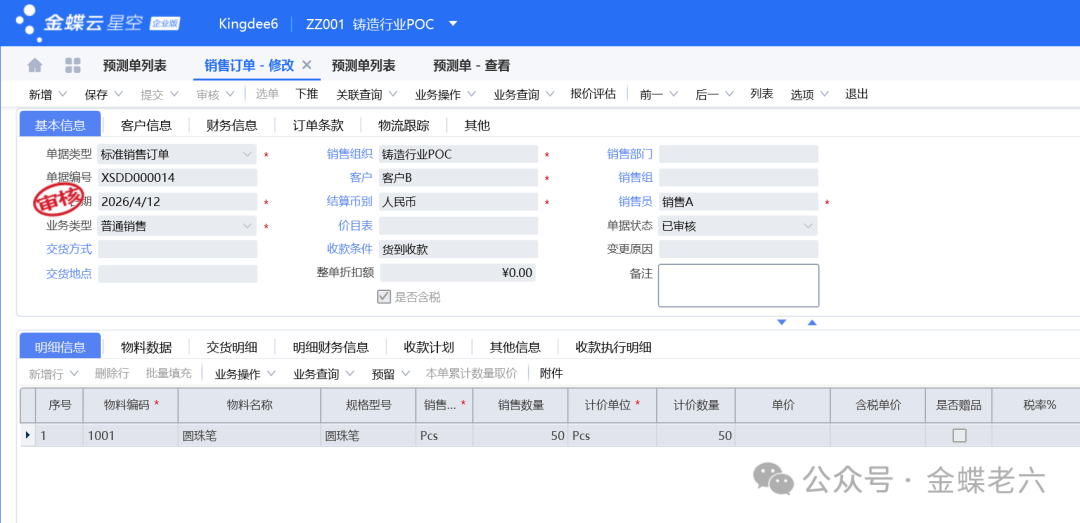 示例先录入一个100的预测单,客户和物料要录入,还有时间。 再录入一个销售订单,客户和物料要和预测单一致。