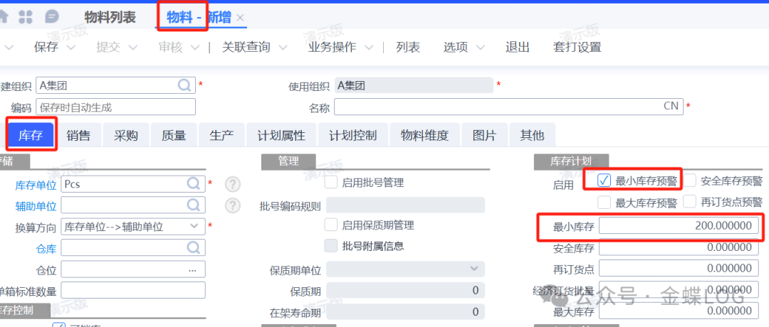 • 物料设置:在物料基础资料中,找到【库存】页签,设定最小库存量。