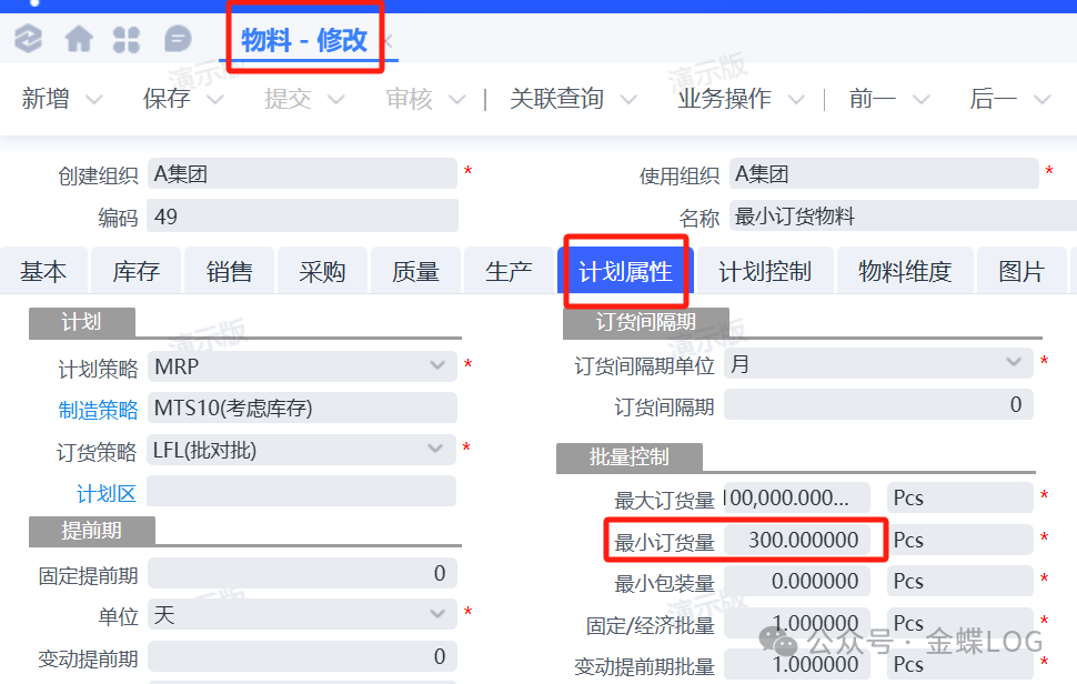 • 打开对应的物料,在【计划属性】页签中,将【最小订货量】设置为指定数值(例如 300)。