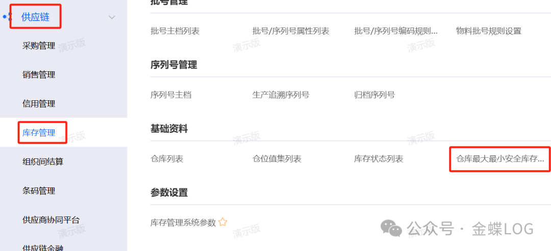 • 仓库+物料设置:通过【仓库最大最小安全库存】单据,为同一物料在不同仓库设置不同的最小库存。