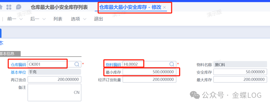 在新增编辑界面录入对应的仓库+物料+最小库存