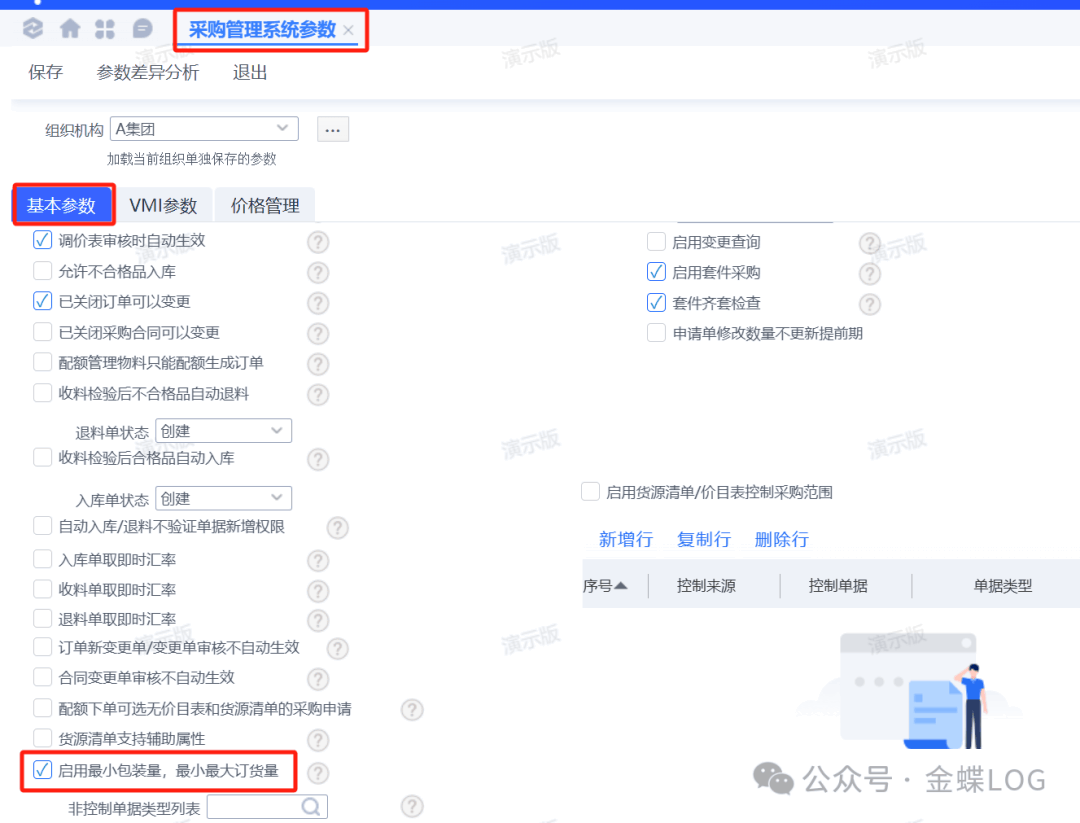 • 采购管理系统参数中勾选 “启用最小包装量、最小最大订货量” 参数。