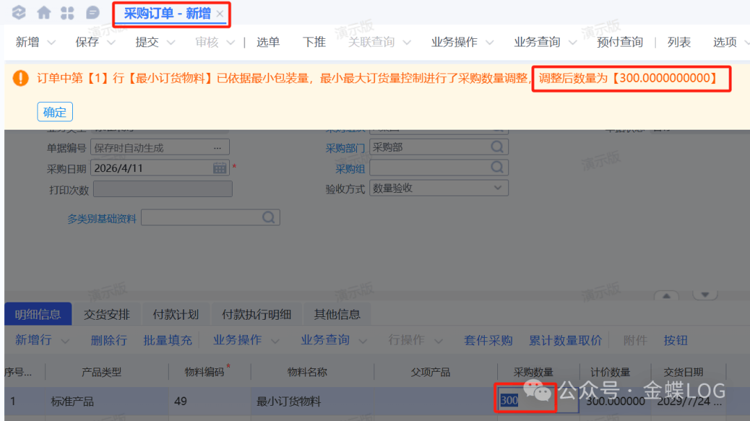 • 当参数设置好后,在下采购订单时,如果数量填写的是100,系统判断该数量小于物料设定的最小订货量300,会自动将其调整为 300。