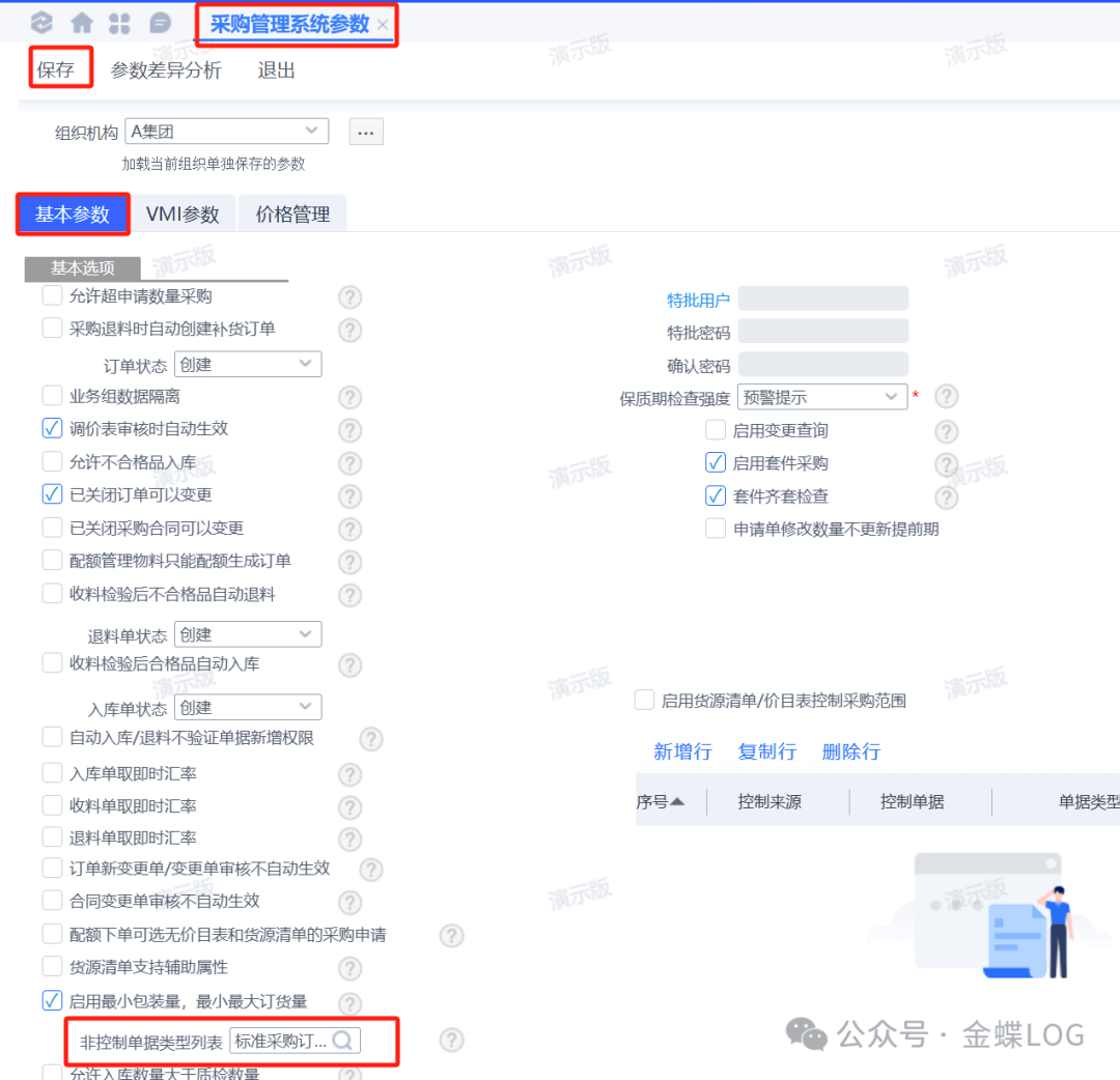 如果不想对某种采购订单类型进行控制,可以在【非控制单据类型列表】里面选择对应的单据类型(比如标准采购订单)