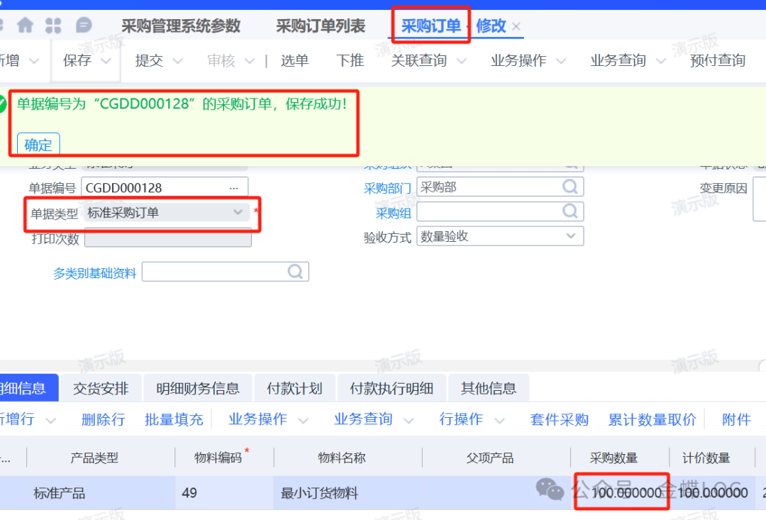 这样用户在以小于最小订货量的数量(100)下标准采购订单时,系统则不会自动进行调整。