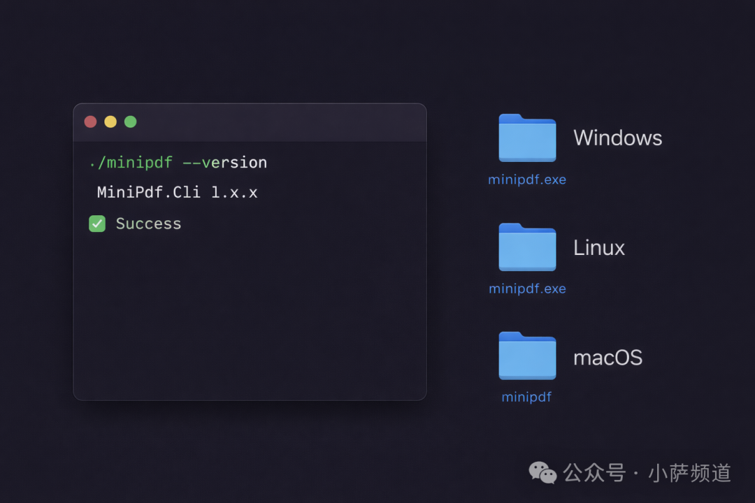 Native AOT:连运行时都不需要如果你的场景更极端——连 .NET 运行时都不想装怎么办? MiniPdf.Cli 支持 Native AOT 编译,直接生成各平台的原生可执行文件。 从 GitHub Releases 下载对应平台的压缩包,解压就能跑: