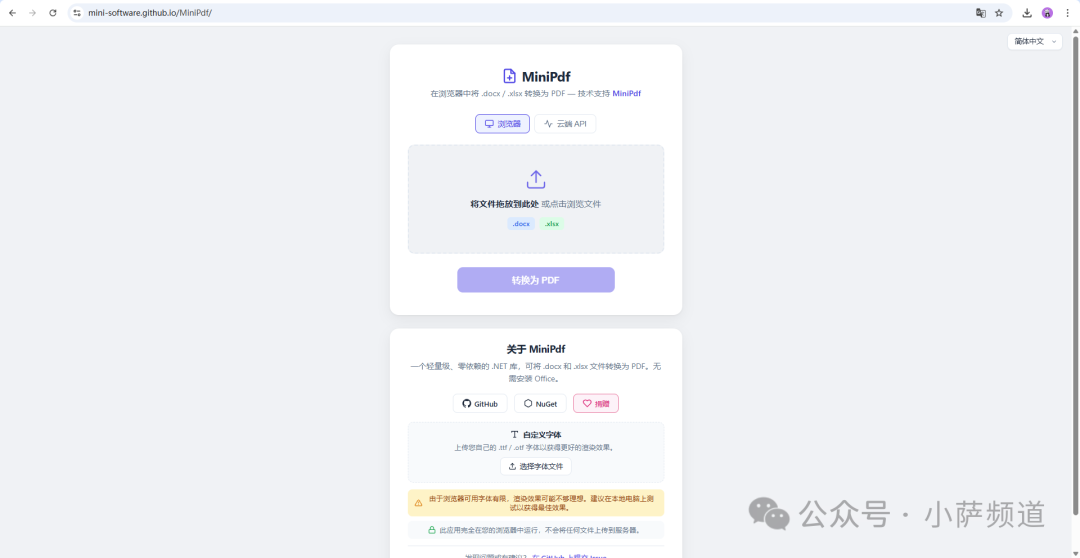 协议友好:Apache 2.0,商业使用仅需署名这是很多技术团队关心的现实问题。 MiniPdf 采用 Apache 2.0 许可证,商业使用仅需保留署名,不需要开源你的业务代码。你可以把它用在公司内部项目、外包项目、甚至打包进商业产品里发行。 结合"零外部依赖"这个特点,这意味着你可以在不引入任何合规风险的前提下,把 Office 到 PDF 的转换能力嵌入到任何产品里。 适用场景说几个我第一时间想到的落地场景: 报表系统:很多系统的报表模块要导出 PDF,用 MiniPdf 在服务端直接生成,不用前端 JS 库做复杂排版,也不用装 Office。 合同生成:把 Word 模板渲染后直接转 PDF,一行调用,没有 COM,没有进程调度。 电子发票:财务系统生成 Excel 格式的对账单,自动转 PDF 存档,服务端无依赖。 CI/CD 流水线:把测试报告、周报自动转 PDF 并发送,不需要在 Runner 上装 LibreOffice。 文档归档系统:大批量 Office 文件转 PDF 归档,Native AOT 模式下可分布式部署,性能线性扩展。 在线体验:不用安装,先试试再说如果想先看看效果再决定要不要用,官网有在线 Demo: