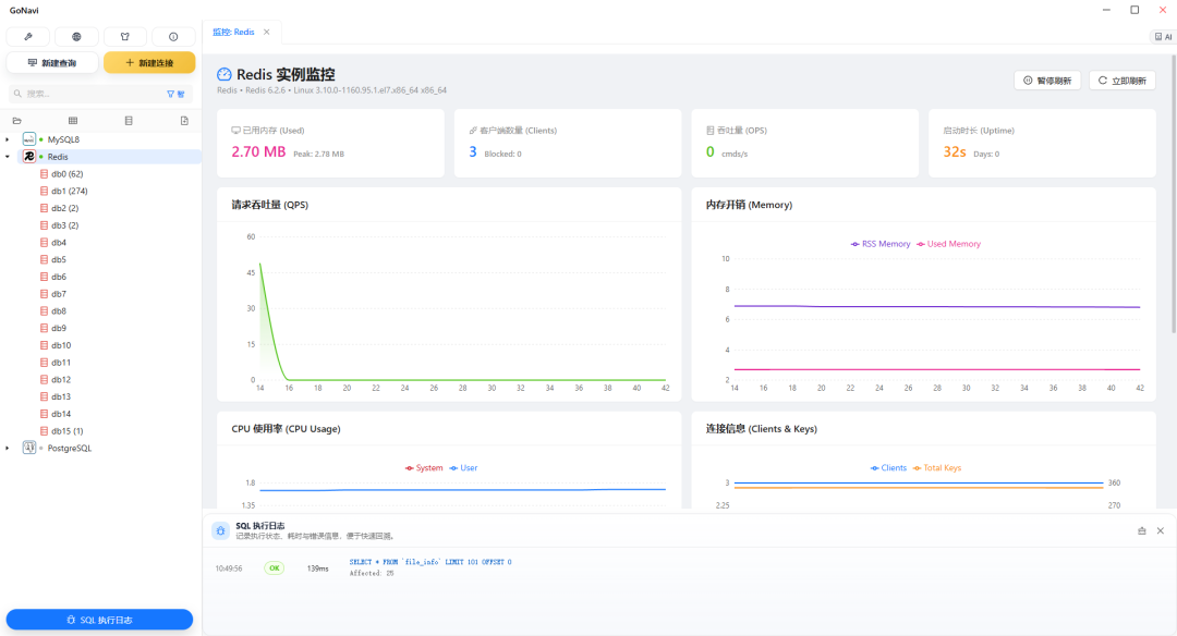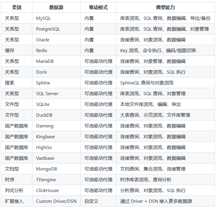 - 「多数据源统一管理」:支持 MySQL、PostgreSQL、Oracle、Redis、SQL Server、MongoDB、ClickHouse 等主流数据库,同时兼容达梦、金仓等国产数据库