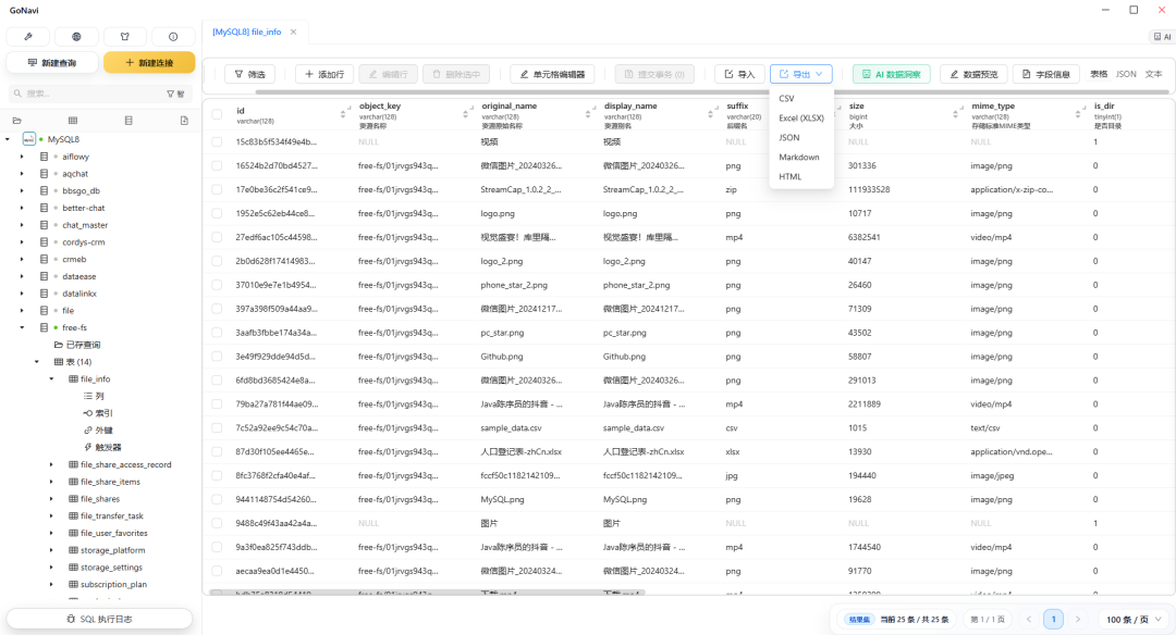 - 「高效数据操作」:支持单元格实时编辑、批量增删改、事务提交与回滚,支持 CSV、Excel、JSON、Markdown 多格式导出