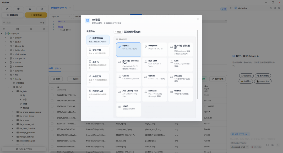 - 「AI 辅助」:可对接 OpenAI、Gemini、Claude 等大模型,根据表结构自动生成 SQL、优化语句、执行计划分析