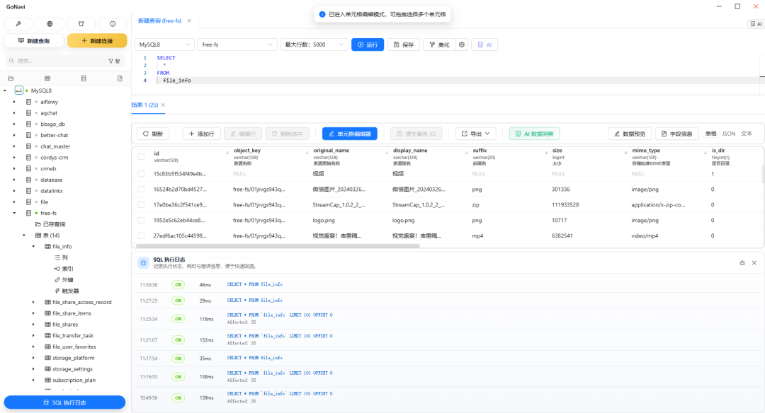- 「强大 SQL 编辑体验」:内置 Monaco 编辑器(VS Code 同款),支持语法高亮、智能补全、多标签页、执行日志与耗时统计