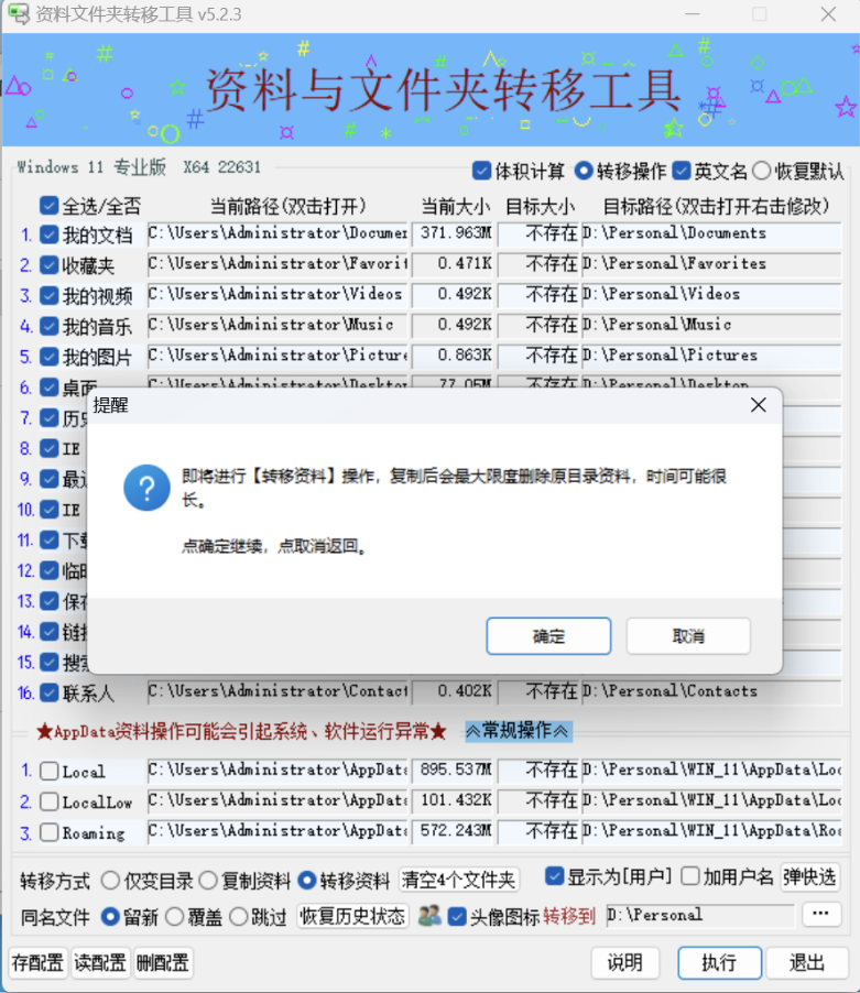 01 聊一聊 今天给大家分享一款文件夹转移工具。 附件:Windows系统资料文件夹转移工具V5.2.3.rar 02 软件介绍 这是一款绿色单文件小工具,体积仅有 548K,非常小巧轻便。 它可以一键将「我的文档」「收藏夹」「我的视频」「我的音乐」「桌面」「临时文件」等系统目录,转移到非系统盘。 ![]() 默认会转移到 D 盘,如果你想换到其他盘,点击右下角的三点按钮,选择目标文件夹即可修改。 ![]() 工具提供三种转移方式:仅变目录、复制资料、转移资料。 「仅变目录」只修改文件夹的链接指向,「复制资料」会在新位置复制一份,原文件保留不删除。 ![]() 转移完成后,会显示完整的文件转移信息。 ![]() 该文章在 2026/4/24 10:57:56 编辑过 |