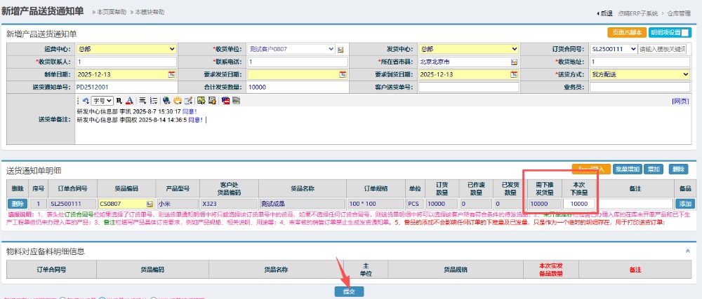 点晴模切ERP销售部下推发货通知