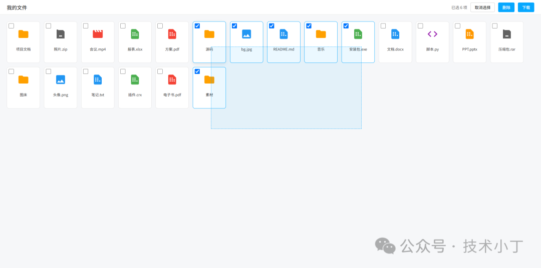 滑动框选是Web应用中常见的交互模式之一,广泛应用于操作系统资源管理器和各类在线文档管理系统中。通过简单的拖拽动作就能快速选择多个目标项,极大地提升了用户操作效率。本文将介绍如何使用HTML、CSS和JavaScript实现一个支持滑动框选功能的文件管理界面。效果演示用户可以在网格区域内自由拖拽形成一个矩形区域来选择多...