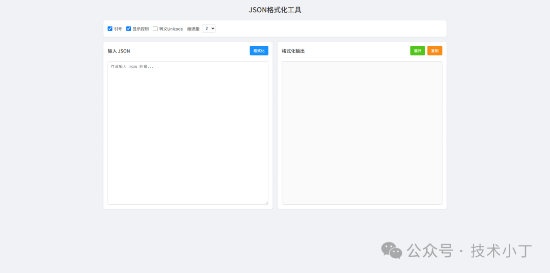 在日常的开发工作中,我们经常需要处理和调试JSON数据。一个美观且功能丰富的JSON格式化工具不仅能提高开发效率,还能帮助我们更好地理解复杂的数据结构。本文将介绍如何使用HTML、CSS和JavaScript实现一个功能完整的JSON格式化工具。效果演示这款JSON格式化工具具有直观的用户界面,分为左右两个面板:左侧为...