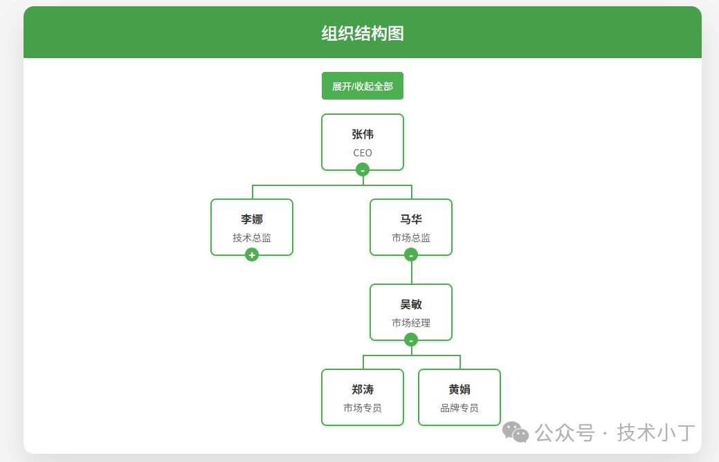 在企业管理系统或团队协作平台中,组织结构图是一种重要的可视化工具,能够清晰地展示公司的层级关系和人员分布。本文将详细介绍如何使用HTML、CSS和JavaScript从零开始构建一个具有交互功能的组织结构图。效果演示本项目呈现了一个典型的公司组织架构,从上级开始逐层向下展示各个部门及员工职位。用户可以通过点击节点上的+...