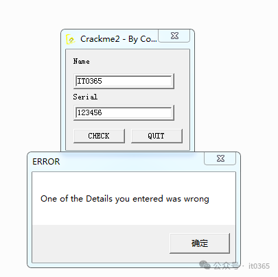 今天这个学习样本软件,非常简单,非常适合零基础朋友练手,快速入门软件逆向破解。接下来跟着我一起最多花5分钟,你就能把这软件的注册码攻下来。填入错误的用户与注册码,直接报错了。还是老规矩,打开调试器OllyDBG,将要破解的软件拖进调试器里,F9运行它。点击CHECK后,点击调试器上的暂停程序,在点击如下打开堆栈窗口,找...