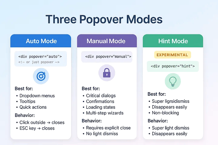 上周二,改一个“远古”管理后台的时候,被气笑了。为了维护几个弹窗,居然堆了500多行JavaScript:管理焦点的focustrap监听Esc关闭点击遮罩关闭一堆ARIA无障碍属性禁止body滚动各种事件绑定、解绑、边界情况……如果你写过稍微像样一点的Web应用,你八成也干过这些事。各种modal、dropdown、...